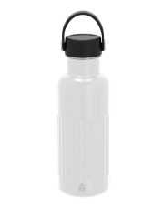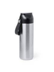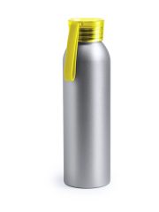 Bidon en aluminium de 650 ml de capacité. Corps en couleur argentée, avec bouchon de sécurité à vis dans une gamme variée de couleurs transparentes. Ruban de transport en matériau TPR assorti. Personnalisations possibles :TAMPOGRAPHIE MAT ESP F