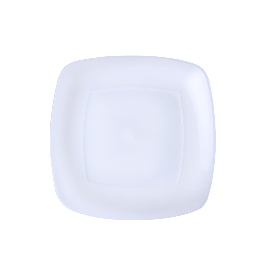 Assiette plate en matériau PP résistant et flexible. Réutilisable et en finition translucide carrée.