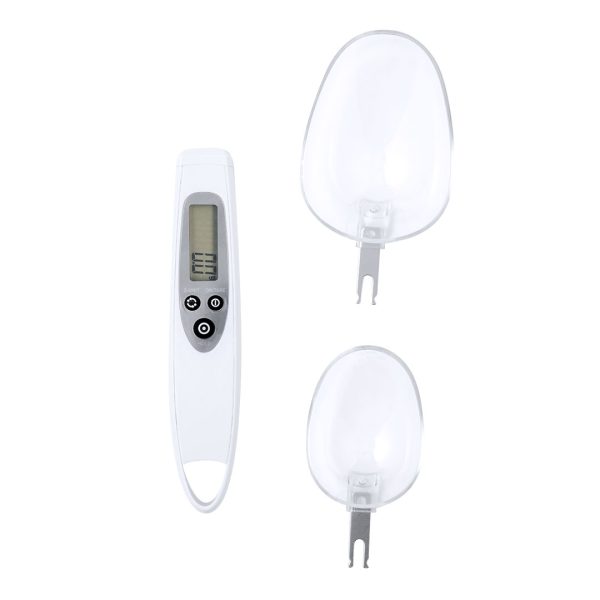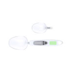 Balance numérique pratique avec cuillère, valable pour les liquides et les solides. Elle comprend 2 cuillères interchangeables et un écran numérique LCD situé sur la poignée, montrant la pesée avec une précision de 0,1g. Bouton pour afficher le poids en grammes (g), onces (oz), ou millilitres (ml), avec fonction de mémoire et possibilité de peser deux ingrédients. Les deux cuillères ont gravé une échelle de mesure supplémentaire pour les liquides : la petite cuillère de 5ml à 25ml; et la grande cuillère de 10ml à 50ml. Avec manuel d’instructions en anglais et espagnol. Alimentée par pile bouton (incluse) et présentée individuellement dans la boîte de conception kraft.