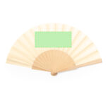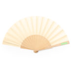 Éventail fabriqué avec des tiges en bois et en coton en combinaison avec le polyester. De couleur naturelle et présenté en boîte individuelle design kraft.