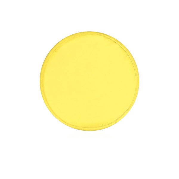 Frisbee pliable en polyester aux couleurs vives, avec boîtier assorti individuel et système de pliage facile pour une taille compacte.