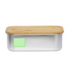 Boîte à lunch / Lunch Box de la gamme éco-friendly. Couvercle et couverts en bambou, avec compartiment principal en acier inoxydable d’une capacité de 600 ml. Comprend fourchette + couteau et un couvercle hermétique avec élastique. Présenté sous boîte individuelle.