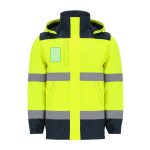 Veste rembourrée haute visibilité avec un design bicolore. Fabriqué en tissu extérieur imperméable et avec des coutures thermoétanchées, il offre une protection contre le vent et la pluie. Avec deux bandes réfléchissantes horizontales sur le corps et deux sur les manches, assurant une visibilité optimale en faible luminosité.Comprend une capuche roulante, une fermeture éclair avant et un rabat velcro, ainsi que des poignets réglables et une taille élastique pour un meilleur ajustement. Il possède deux poches latérales avec fermeture éclair, une poche sur la poitrine droite et une poche intérieure avec fermeture éclair.Il intègre un accès intérieur à l’arrière pour le retraitement ou la personnalisation.