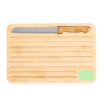 Table de cuisine fabriquée en bambou, accompagnée d’un couteau. Sa face lisse permet diverses applications, tandis que l’autre présente des sillons gravés sur le bois, idéal pour couper du pain ou des aliments juteux. Comprend un compartiment avec un couteau de scie en feuille d’acier et une poignée en bambou. Des matériaux comme le bambou favorisent l’utilisation de matières premières naturelles et réduisent les émissions polluantes. Il est issu d’une plante très résistante et polyvalente, avec une croissance et une régénération rapides, ce qui est une excellente alternative à l’utilisation du bois traditionnel.