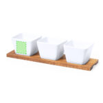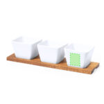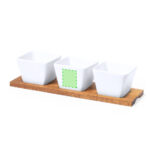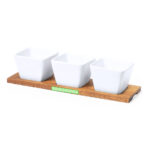 Plateau à hors-d’œuvre avec 3 bols blancs en céramique. Comprend une base en bois naturel, découpée pour s’adapter aux bols. Présentation en boîte individuelle de conception kraft.