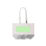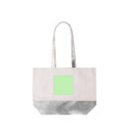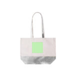 Sac en matériau coton recyclé de 220 g/m2 en combinaison avec éco-cuir métallisé. Avec soufflets et poignées de 70cm, disponibles en or, argent et or rose, avec base assortie. Résistance jusqu’à 8 kg de poids.