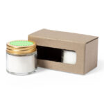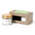 Ensemble de bougies aromatiques, à la cire végétale et à l’arôme de fleur de Fresia. Dans un pot en verre avec un bouchon à vis en métal et une finition dorée. Présenté en boîte kraft individuelle.