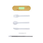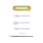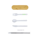 Ensemble de couverts fabriqués en PP et sans BPA, accompagnés d’un étui de présentation assorti et d’un couvercle en bambou. Ce set complet comprend une cuillère, une fourchette, un couteau et une paille pliante avec leur nettoyeur respectif. Il est certifié Food Grade, garantissant la sécurité lorsque les aliments entrent en contact avec le matériel utilisé pour fabriquer le produit. Présentés en sachet individuel recyclé.Des matériaux comme le bambou favorisent l’utilisation de matières premières naturelles et réduisent les émissions polluantes. Il est issu d’une plante très résistante et polyvalente, avec une croissance et une régénération rapides, ce qui est une excellente alternative à l’utilisation du bois traditionnel.