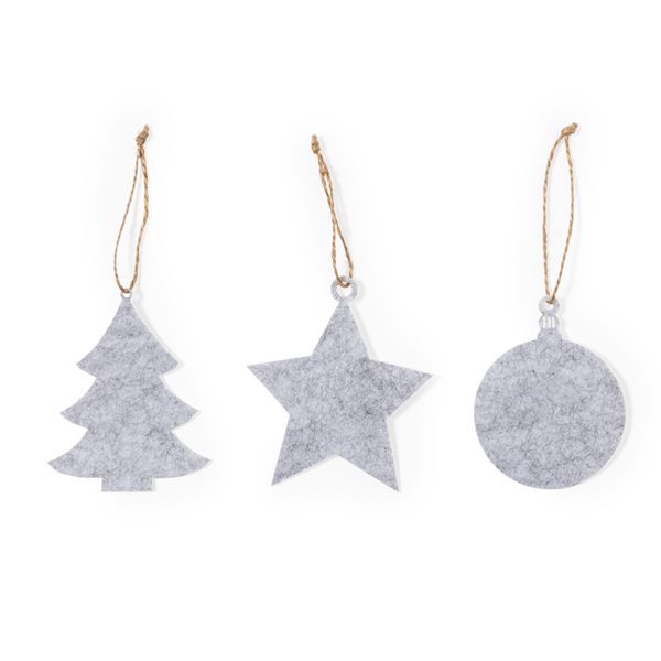 Ensemble de 3 décorations de Noël en feutre doux. Comprend 3 motifs : sapin de Noël, étoile et boule de Noël. Toutes les pièces comprennent un cintre. Présenté dans un sac en papier recyclé.