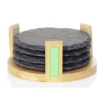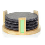 Set de 4 sous-verres en ardoise naturelle, avec support en bambou. Présenté dans une boîte attrayante individuel au design avec une finition kraft.