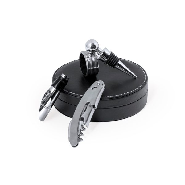 Ensemble de vins au design circulaire élégant, finition éco-cuir, avec accessoires en acier inox. Comprend un tire-bouchon à 2 temps avec un coupe-capsule et un ouvre-bouchon, un doseur et un collecteur de gouttes. Présenté dans un étui unique en éco-cuir avec intérieur en mousse de couleur noire.