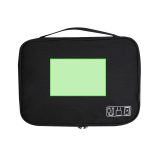 Étui organisateur RPET 600D. Grand format, 3 poches à ouverture complète avec doubles tirettes métal, multiples compartiments intérieurs, poignée, logo RPET.