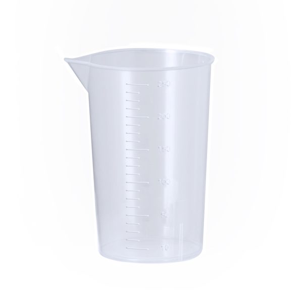 Gobelet doseur de 250 ml en PP transparent résistant. Avec une jauge latérale en tranches de 10ml et verrou sur le bord pour éviter les déversements.