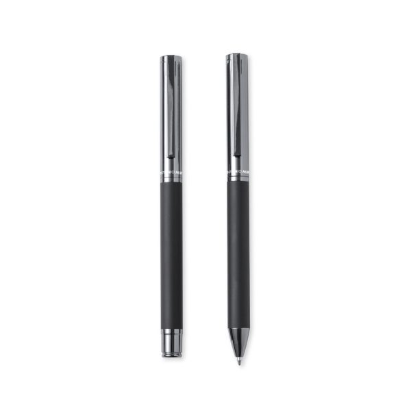 Ensemble stylo et roller Antonio Miró. Comprend :Stylo à bille métallique avec un corps noir mat. Détails et capot en chrome avec le logo de la marque cartouche jumbo et à l’encre bleue.Rollerball métallique avec corps noir mat. Détails et capot en chrome avec le logo de la marque. Cartouche Jumbo et à l’encre bleue.Présenté dans un étui individuel noir élégant et résistant avec le logo Antonio Miró, une fermeture magnétique et une housse de protection assortie.