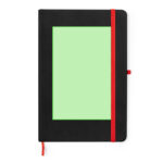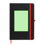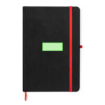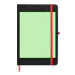 Carnet avec couverture similicuir. Couleur noire, incluent une fermeture élastique pour le stylo et un ruban marque-page assortie à l élastique. Revêtement extérieur spécialement conçu pour un marquage laser, Comprend 100 feuilles lignés.