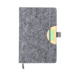 Bloc-notes avec support de couvertures rigides en feutre RPET 300D. Avec support original pour smartphone et tablette intégré dans la couverture, en bambou. Comprend fermeture élastique et support pour stylo assorti, avec 80 feuilles intérieures à lignes. Avec logo RPET Logo à l’arrière et présenté dans un sac individuel recyclé.Le feutre RPET est le fruit de la combinaison du processus de recyclage des matières plastiques et de la technique millénaire de fabrication du feutre, ce qui donne un matériau éco-tendance qui, en plus d’être d’origine recyclée, devient également recyclable.