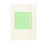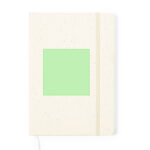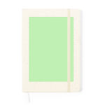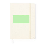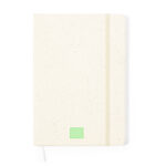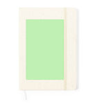 Bloc-notes A5 avec couvertures rigides en carton recyclé résistant. De 100 feuilles blanches unies et bande élastique pour sa fermeture. Présenté dans un sac recyclé individuel.