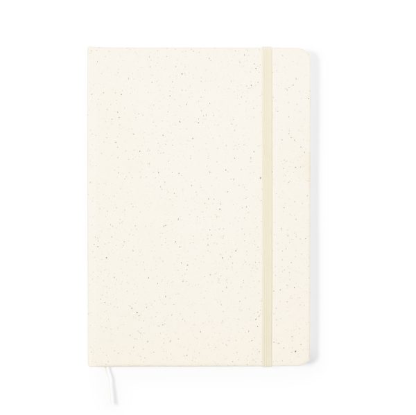 Bloc-notes A5 avec couvertures rigides en carton recyclé résistant. De 100 feuilles blanches unies et bande élastique pour sa fermeture. Présenté dans un sac recyclé individuel.