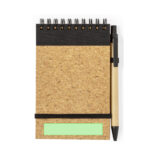 Carnet et stylo à bille en liège et carton recyclé. Le bloc-notes annulaire se distingue par ses couvertures rigides en liège naturel, avec 80 feuilles intérieures à une ligne. Comprend un stylo à bille à bouton-poussoir avec baril en carton recyclé et encre bleue. Présenté dans un sac en papier recyclé.Fabriqué avec des éléments végétaux pour promouvoir l’utilisation de matières premières naturelles et réduire les émissions polluantes.