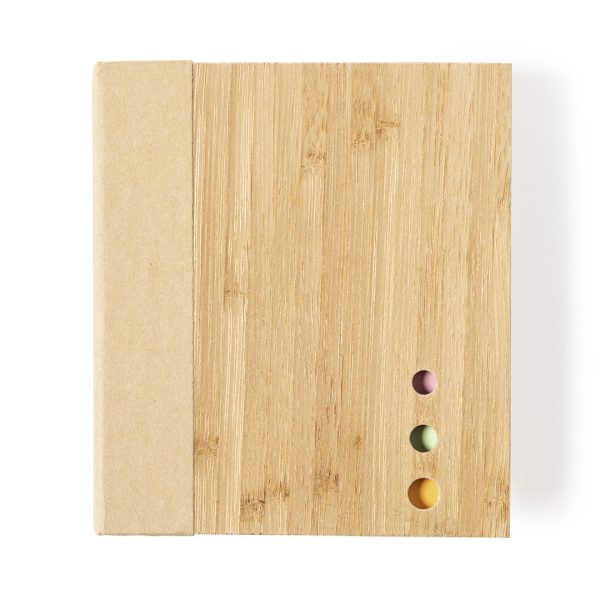 Porte-note de la ligne Nature avec couvercles rigides en bambou. Avec 115 feuilles adhésives kraft, 115 feuilles adhésives moyennes et 420 mini-notes autocollantes.