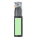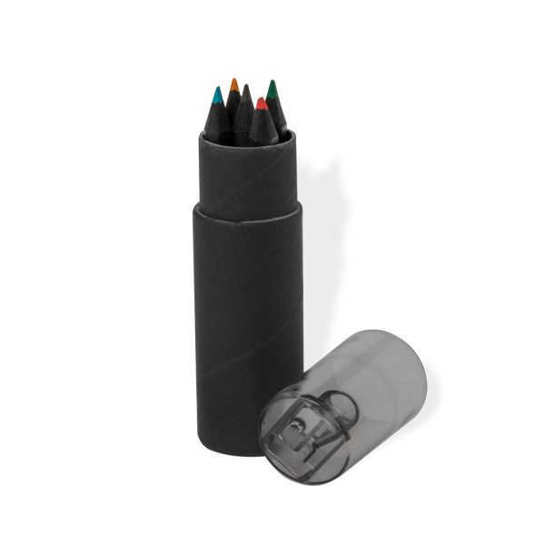 Set de 6 crayons en bois de couleur noire, avec corps hexagonal et mines en différentes couleurs. Présentés dans un boîtier cylindrique en carton recyclé noir, avec capuche transparente assortie et taille-crayon intégré.