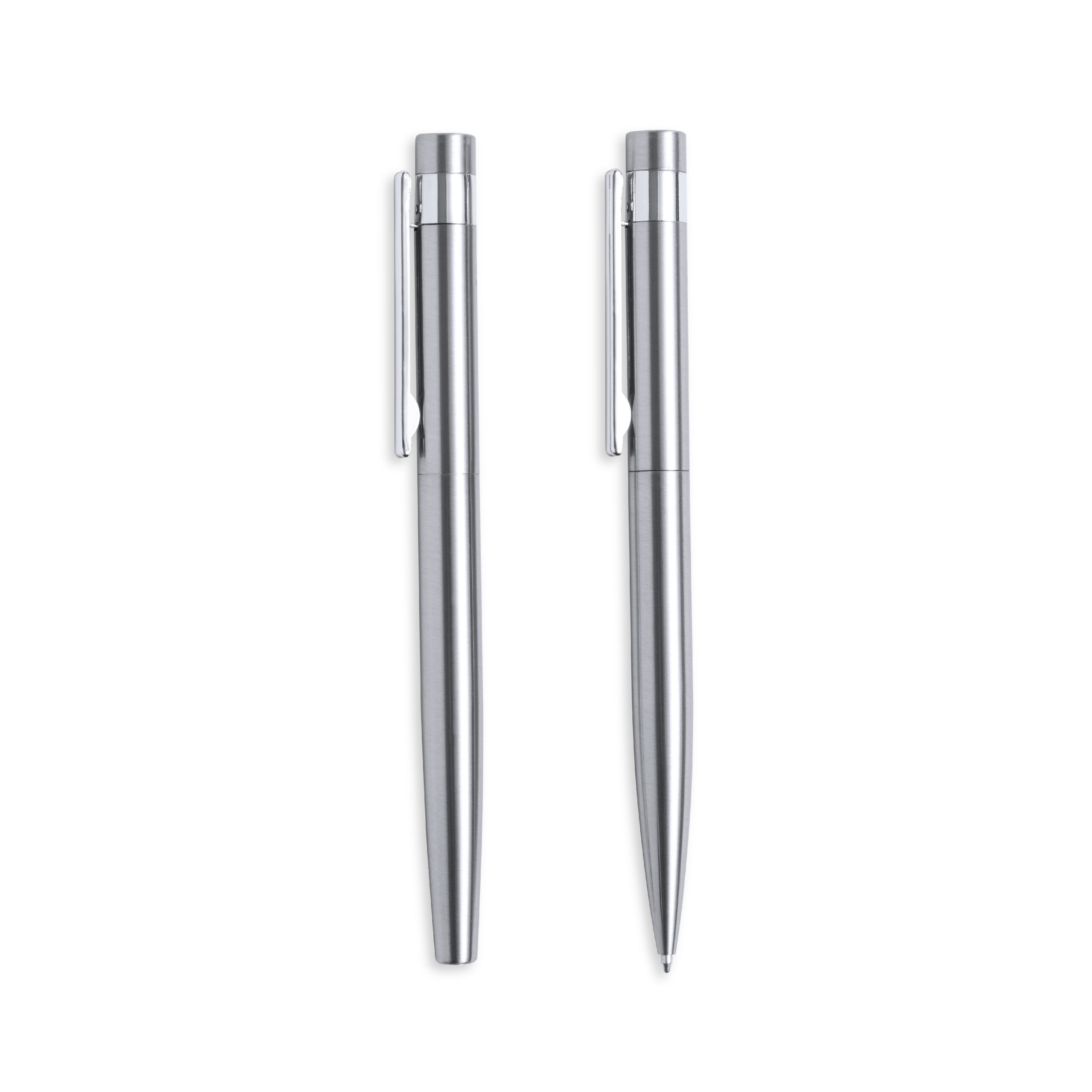 Ensemble écologique composé d’un stylo et d’un roller, en acier inoxydable recyclé. Comprend :Stylo bille à mécanisme rotatif, avec corps finition argent et accessoires chromés. Clip métallique et acier inoxydable recyclé distinctif sur le dessus du stylo. Cartouche Jumbo et encre bleue.Stylo roller avec corps argenté et accessoires chromés. Clip métallique et acier inoxydable recyclé distinctif en haut de la hotte. Cartouche Jumbo et encre bleue.Ensemble présenté dans un écrin design kraft individuel avec une housse assortie.L’acier est l’un des matériaux les plus demandés et peut être trouvé presque partout, des produits de tous les jours aux grandes constructions. Avec d’innombrables propriétés, y compris la durabilité et son haut degré de réutilisation, ce qui en fait une alternative très appréciée dans les solutions de durabilité. Correctement traité, il permet d’obtenir de nouvelles ressources d’utilisation infinie.