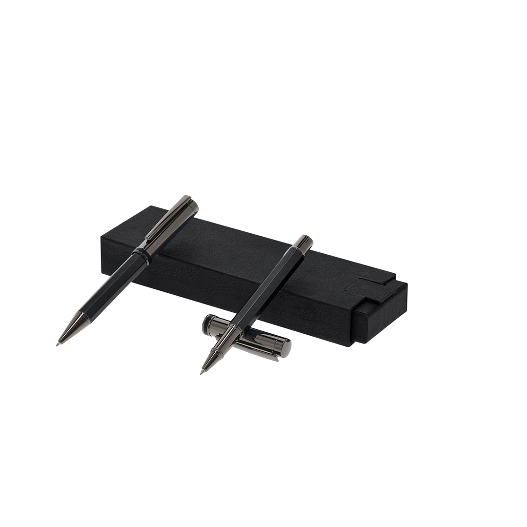 Ensemble exclusif de stylo à bille et stylo roller de la plus haute qualité de la collection Limited Edition. Un accessoire moderne, fonctionnel et magnifique qui dépasse toutes les attentes. Distingué par son design élégant et minimaliste. Fabriqué en acier inoxydable résistant et durable, en parfaite combinaison avec de l’aluminium. Stylo à bille avec un système sophistiqué d’ouverture par rotation et stylo roller avec un capuchon pratique. Design de prise hexagonale dans des couleurs métalliques mates et un dessus anthracite brillant et sobre. Avec clip en métal, encre bleue et rechargeable (stylo roller avec cartouche jumbo).De la parfaite combinaison d’exclusivité et de design, naît Limited Edition, une collection spéciale d’idées promotionnelles en édition limitée. Un nouveau concept, inspiré par la fusion de produits haut de gamme avec les tendances les plus récentes et innovantes, et avec une sélection limitée disponible, transformant un cadeau en une expérience unique et inoubliable.Boîte de présentation Exclusive Limited Edition, avec un design protégé par des droits de propriété industrielle.Inclut une carte avec la description de la Limited Edition en carton recyclé.