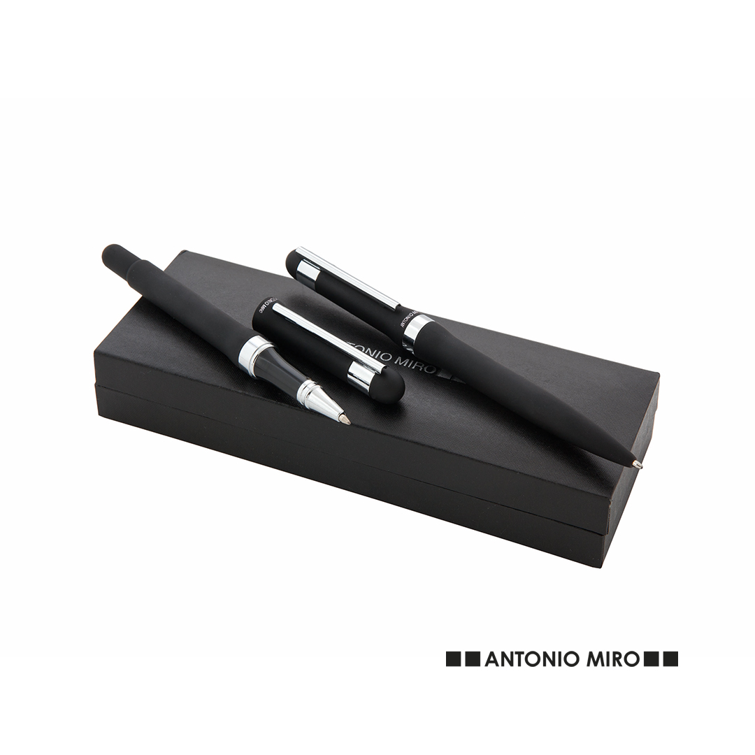 Elégant ensemble Antonio Miro comprenant un stylo à mécanisme pivotant et un roller avec son capuchon original bagué. Corps métallique en noir brillant avec clip coloris argent. Livré dans une housse présentée dans un étui noir au logo de la marque. Encre bleue.