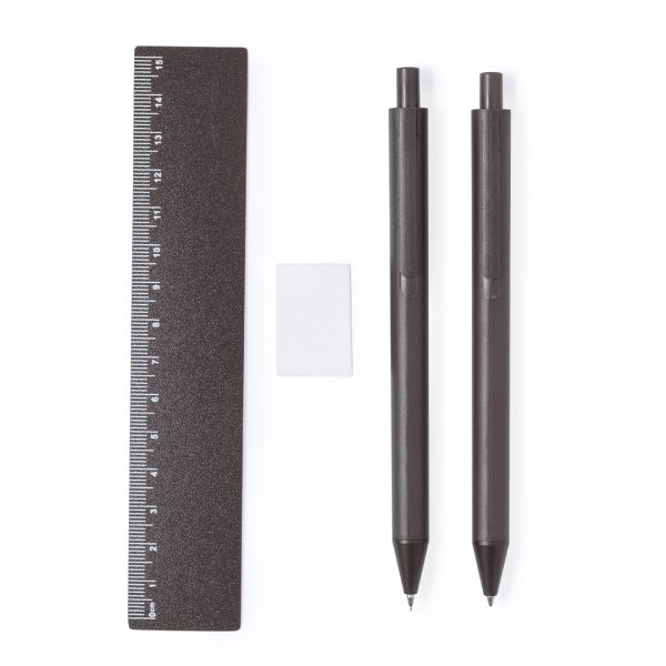 Set de stylo à bille, porte-mine et règle, en fibre de café. Stylo à bille à encre bleue et porte-mine avec 2 mines de 0,7mm incluses, les deux avec clip. Comprend une règle pratique de 15 cm et utile gomme. Présenté dans un étui individuel en fibre de café. Fibre de café Logo sur le dessus du stylo à bille et porte-mines.La fibre de café est une solution circulaire obtenue à partir de l’utilisation des déchets produits dans la production du café. Une alternative durable qui favorise la réduction de l’utilisation des plastiques, en économisant de l’énergie dans leur processus de fabrication et en contribuant à la protection de l’environnement.