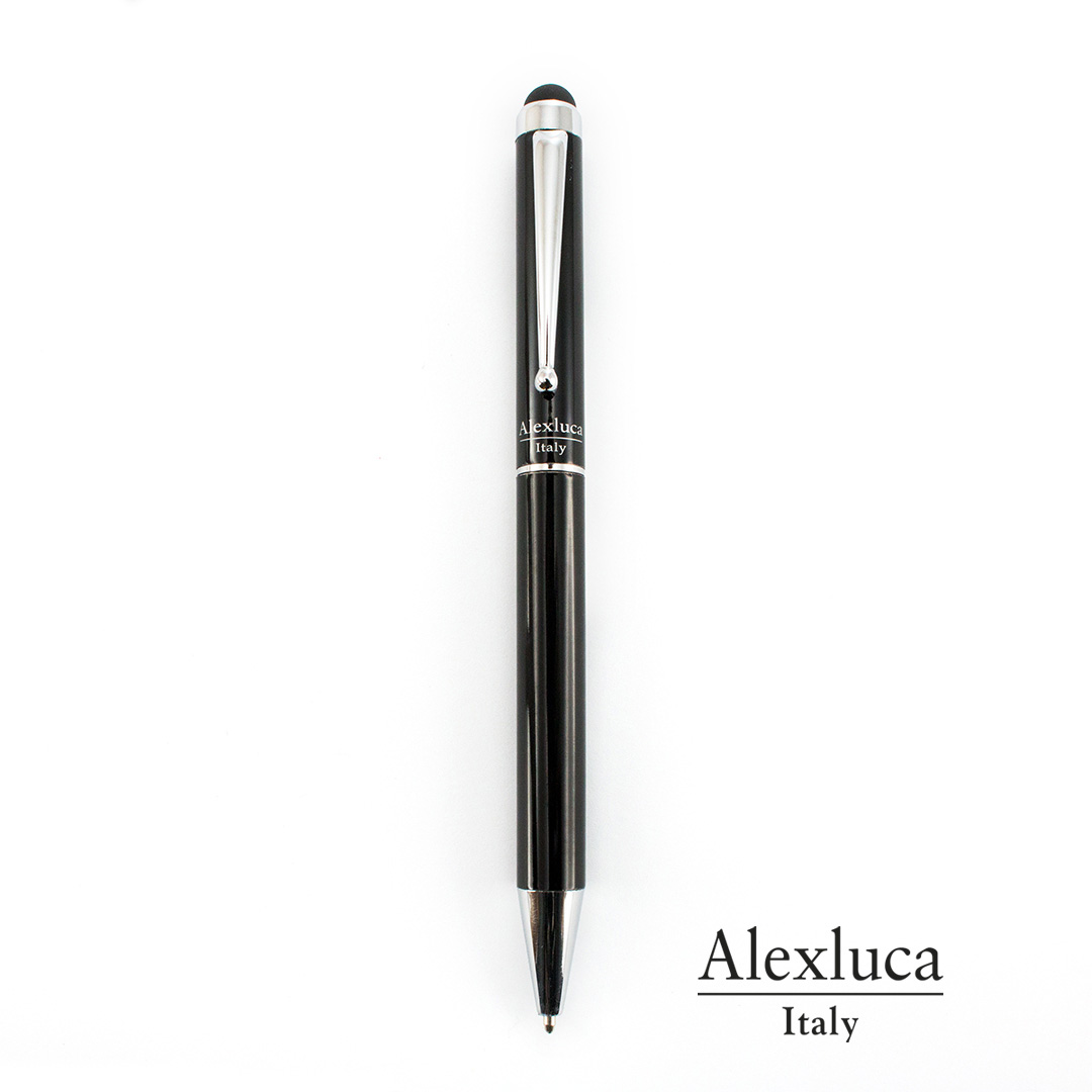 Stylo pointeur Alexluca avec mécanisme pivotant et corps métallique noir lisse. Clip et embout assortis. Présenté dans un étui noir individuel avec le logo de la marque. De l´encre bleue.