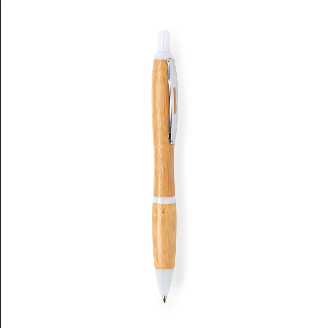 Stylo à bille poussoir. Corps en bambou avec un clip métallique original et une prise en main bambou très agréable. Encre bleue.