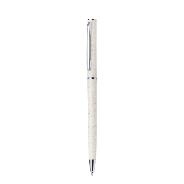 Stylo avec corps en canne à blé. Clip métallique et accessoires chromés. Mécanisme rotatif et encre bleue. Avec canne à blé Logo et disponible en couleur nature.La canne à blé encourage l’utilisation de matières premières naturelles, réduisant ainsi les émissions polluantes.