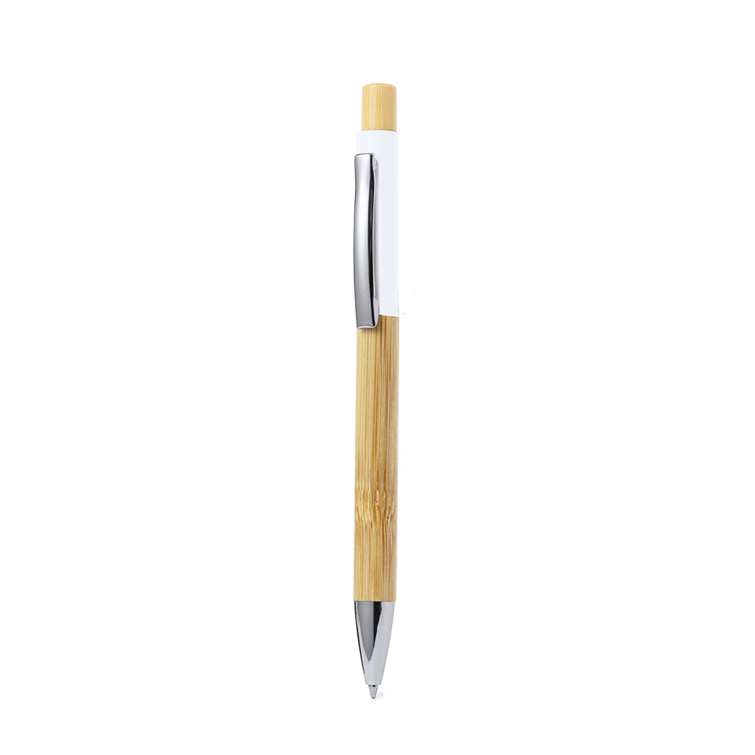 Stylo à bille élégant en bambou. Corps en aluminium résistant de finition en caoutchouc et poignée en bambou, avec la canne dans une large gamme de couleurs distinctives. Clip métallique, avec mécanisme de bouton-poussoir et encre bleue. Présenté en sachet individuel recyclé.Des matériaux comme le bambou favorisent l’utilisation de matières premières naturelles et réduisent les émissions polluantes. Il est issu d’une plante très résistante et polyvalente, avec une croissance et une régénération rapides, ce qui est une excellente alternative à l’utilisation du bois traditionnel.