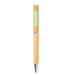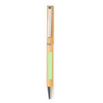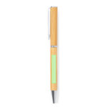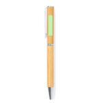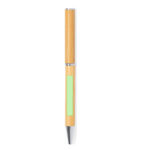 Stylo avec corps en bambou. Clip métallique et accessoires chromés. Mécanisme rotatif et encre bleue. Des matériaux tels que le bambou encouragent l’utilisation de matières premières naturelles en réduisant les émissions polluantes. Il provient d’une plante très résistante et polyvalente, avec une croissance et une régénération rapides, étant une excellente alternative à l’utilisation du bois traditionnel.