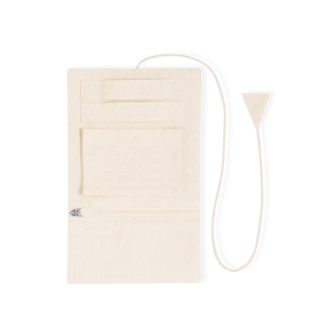 Boîte à bijoux pliable en coton, pour ranger des objets personnels précieux. Fabriqué en 3 parties de couleur naturelle : partie supérieure avec des rubans, partie centrale avec poche et partie inférieure avec poche à glissière, pouvant le plier et le tenir fermement avec son cordon assorti.