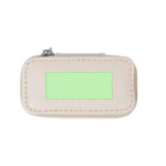 Boîte à bijoux en éco-cuir. Design de couleur naturelle avec fermeture à glissière et deux compartiments à l’intérieur. Un compartiment en forme de petite boîte et un compartiment avec des coussinets pour attacher les bagues et les boucles d’oreilles, doublé de tissu doux. Présenté dans un sac en papier individuel.