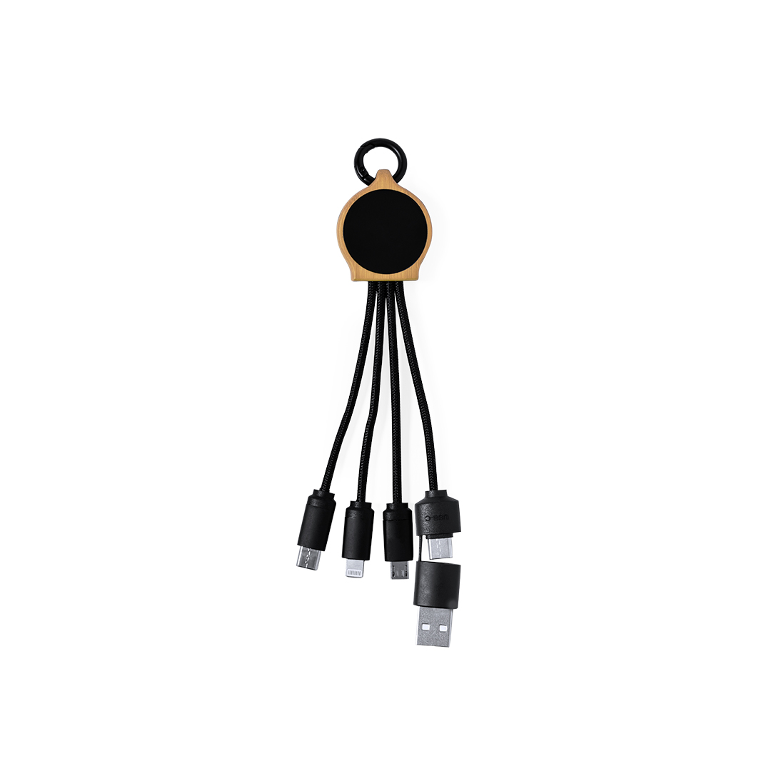 Câble de chargement fabriqué en bambou avec une surface élégante de couleur noire. Il dispose d’une lumière LED intérieure et d’un revêtement extérieur spécialement conçu pour le marquage au laser, illuminant ainsi le logo. Il a des connexions d’entrée USB et USB Type C, et des sorties de Type C, Lightning et Micro USB. Tension de sortie : 5V DC 2.4A. Présenté dans une pochette individuelle au design kraft.