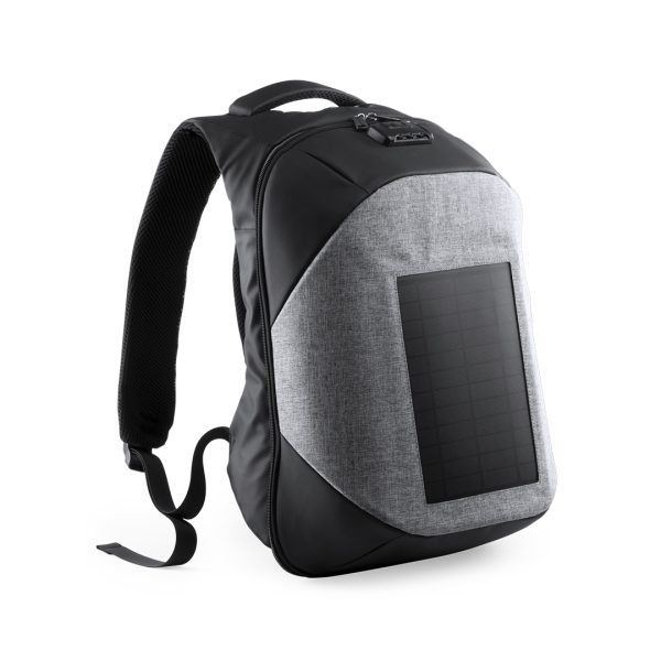 Sac à dos avec panneau solaire intégré en polyester 1200D résistant. Hydrofuge, avec port de chargement USB -powerbank non inclus- et verrou de sécurité avec mot de passe. Compartiment principal avec double tirette. Poche intérieure rembourrée pour ordinateurs portables jusqu’à 15 pouces et tablettes jusqu’à 10 pouces. Bretelles et dos avec rembourrage ergonomique.