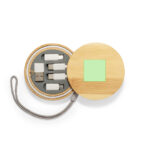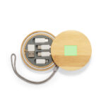 Ensemble de câbles de charge en fibre de blé, avec étui en bambou poli et poignée de transport. Comprend un câble avec capacité de transfert de données et plusieurs connexions, avec têtes Micro USB, Type C et Lightning. CC 5V 3A. Présenté dans une boîte kraft design.Fabriqué avec des éléments végétaux pour favoriser l’utilisation de matières premières naturelles et réduire les émissions polluantes.