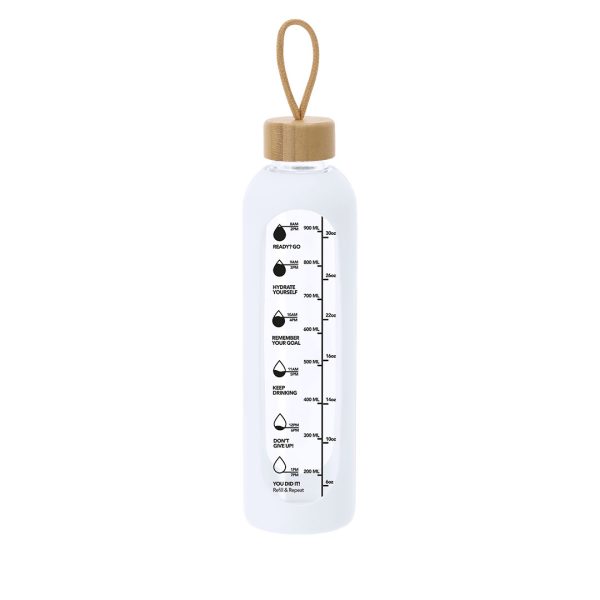 Gourde fabriquée en verre de 1L de capacité, conçue pour favoriser une hydratation adéquate. Couvert d’une housse en silicone qui protège et offre une prise confortable et sécurisée.Inclut un indicateur de capacité en litres et en onces, accompagné de phrases motivantes pour inspirer un bon niveau d’hydratation quotidienne. Le bouchon, élaboré en bambou, inclut un cordon pratique pour favoriser son transport. Sans BPA.