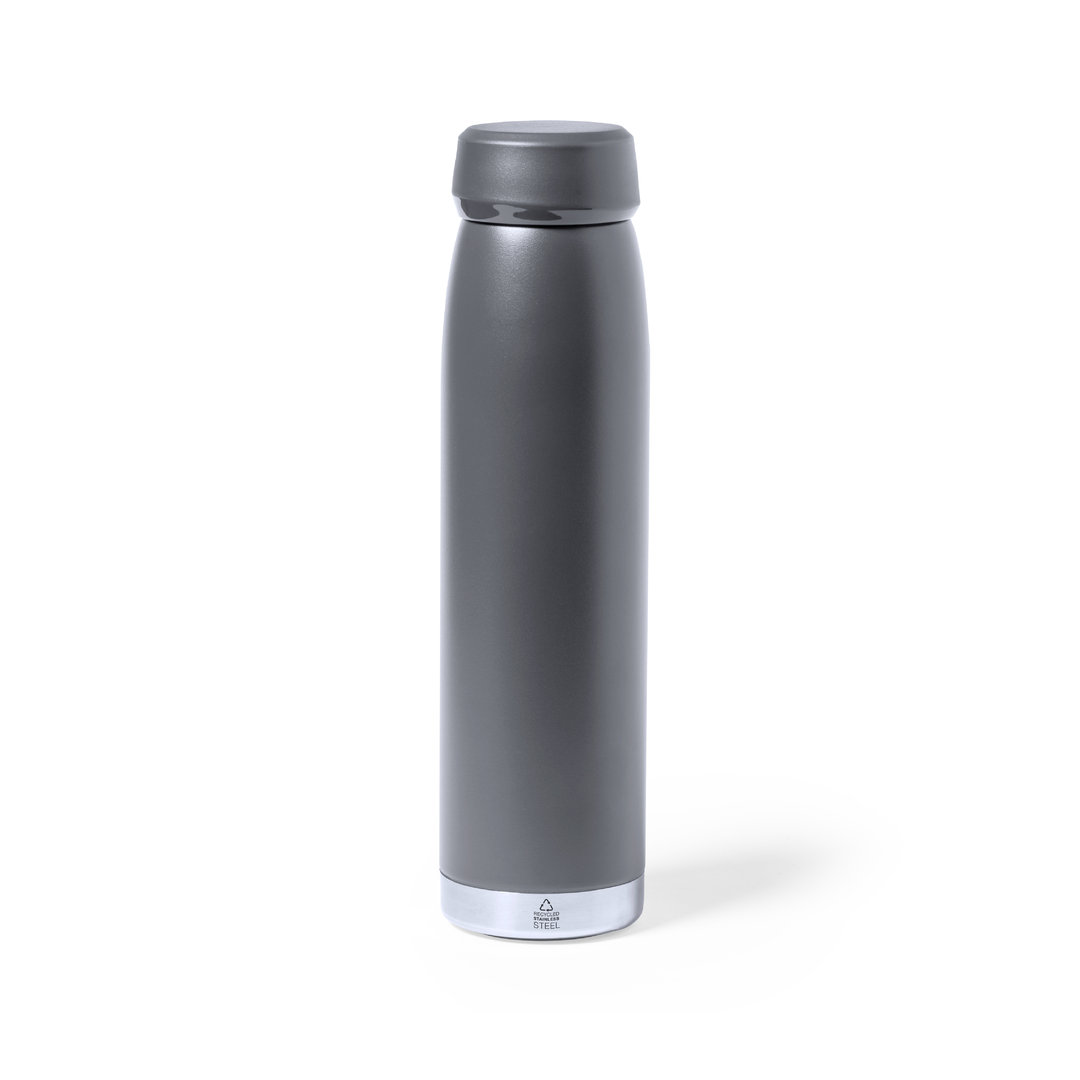 Bouteille thermos d’une capacité de 380 ml, fabriquée en acier inoxydable recyclé à double paroi, avec bouchon à vis assorti et base argentée. Disponible dans une gamme de couleurs satinées, sans BPA et présenté dans une boîte individuelle au design kraft.L’acier est l’un des matériaux les plus recherchés et on le trouve presque partout, des produits quotidiens aux grandes constructions. Il possède d’innombrables propriétés, dont la durabilité et un haut degré de réutilisation, ce qui en fait une alternative très prisée pour les solutions de durabilité. Correctement traité, il permet d’obtenir de nouvelles ressources d’une utilité infinie.