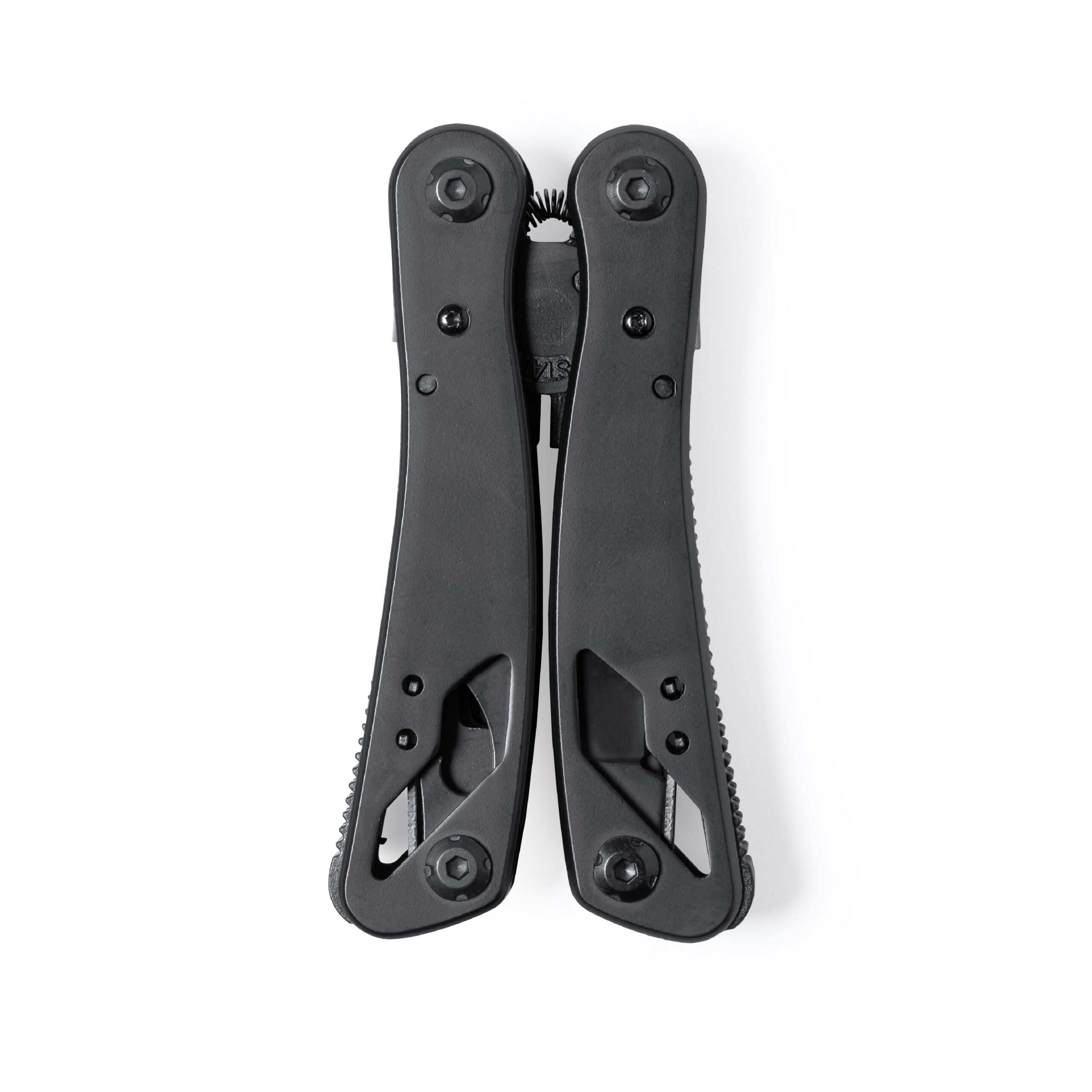 Multitool avec accessoires en acier inoxydable avec une finition noire et une poignée en aluminium résistante assortie. Avec 13 fonctions, dont un couteau et un rasoir tournevis, lime ouvre-porte et pince. Pliable et de taille compacte, présenté dans une boîte design noire individuelle.