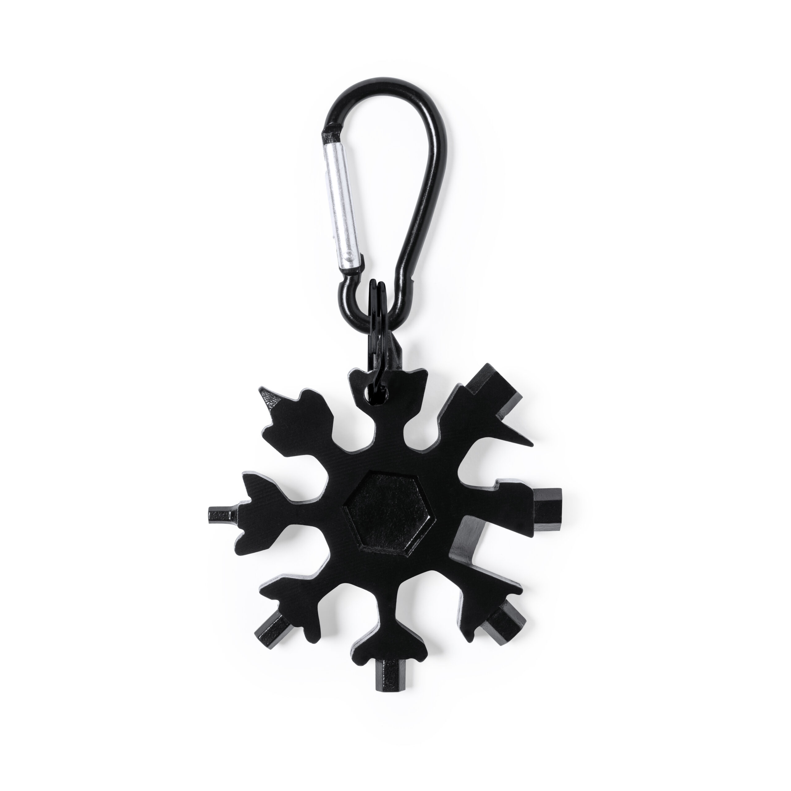Outil multifonction original et pratique en acier inoxydable résistant avec une finition noire, avec anneau et mousqueton assortis. Avec 17 fonctions, entre autres, tournevis plat et cruciforme clés hexagonales de type Allen couteau et décapsuleur. Présenté dans une boîte noire individuelle.