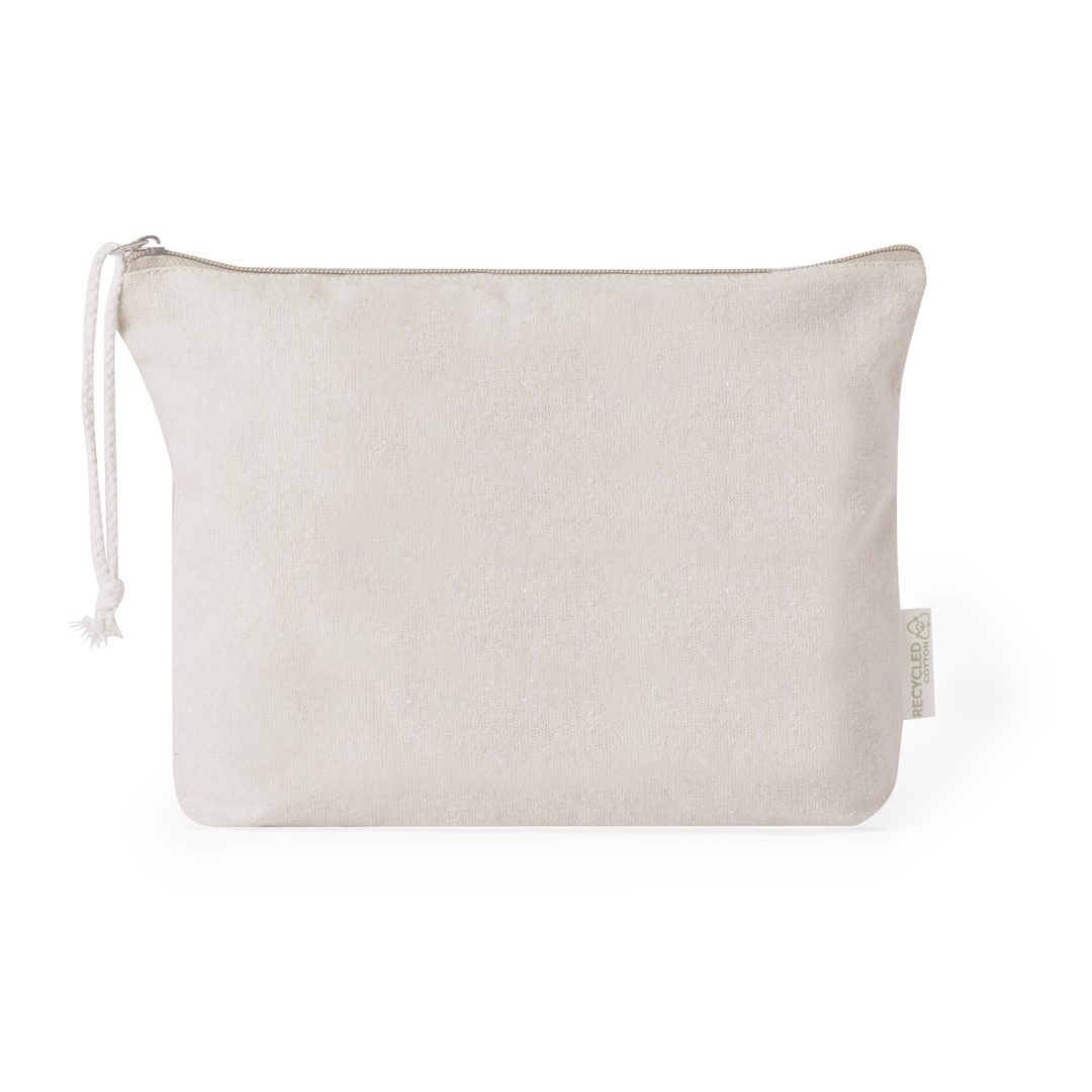 Trousse de toilette en coton recyclé dans un ton naturel élégant. Compartiment principal avec fermeture à glissière et cordon de transport assorti. Comprend une étiquette extérieure avec logo coton recyclé.