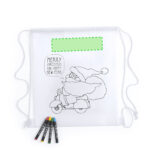 Sac à dos à cordelettes pour enfant sur le thème de Noël. Intissé blanc adapté au coloriage avec crayons de cire. Inclut 4 crayons de cire de différentes couleurs. Avec cordes de serrage et coins renforcés assortis. Disponible avec les motifs Joyeux Noël et Père Noël.