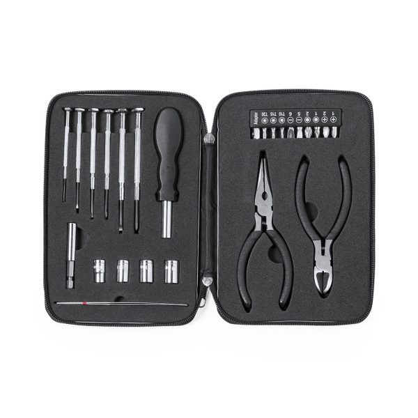 Ensemble d’outils de 25 accessoires dans un boîtier en aluminium résistant avec découpe intérieure en EVA. Comprend un ensemble de tournevis de précision, une poignée multifonction, des embouts interchangeables, des tournevis plats et en étoile têtes de tube et pinces. Présenté dans une boîte individuelle.