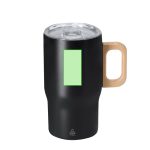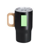 Mug thermique en acier inoxydable recyclé à double paroi, capacité de 400 ml, avec poignée rigide en bois pour plus de confort. Extérieur avec finition biseautée mate. Comprend un couvercle transparent à fermeture par pression avec bec rabattable pour boire facilement, sans BPA. Idéal sur votre bureau, table ou toute surface pour déguster votre boisson préférée. Étiquette Acier Inoxydable Recyclé incluse.