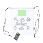 Sac à dos à cordes en RPET non tissé blanc, spécialement conçu pour la coloration avec des cires. Comprend 5 cires de couleurs assorties. Avec cordons de fermeture noirs et coins renforcés. RPET distinctif sur l’étiquette extérieure.Le matériau RPET est fabriqué à partir de plastique recyclé, afin de favoriser la réutilisation des déchets plastiques et d’aider à la durabilité de la planète.