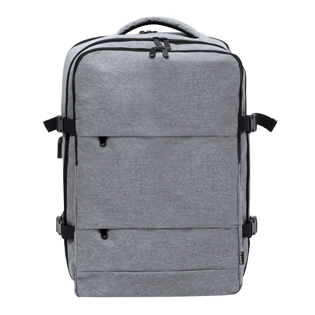 Sac à dos multifonction en 300D RPET. Fabriqué en polyester recyclé et résistant à l’eau, il a une excellente respirabilité à l’arrière, ce qui facilite la dissipation de la chaleur grâce à ses bandes et son dossier rembourrés. Les sangles larges sont conçues pour soulager la pression sur les épaules, permettant de transporter le sac à dos confortablement pendant de longues périodes.Parfait pour toute situationgrÂce aux différents compartiments : 2 poches avant. 3 grands compartiments centraux, dont un portatif, une poche centrale de grande capacité pour ranger des vêtements et/ou des compléments avec organisateur à l’intérieur, et un troisième rembourré, parfait pour transporter portables jusqu’à 17,3 pouces. En outre, il dispose de 3 compartiments spéciaux, une poche latérale parfaite pour un accès rapide, une poche à chaussures à la base avec des anneaux de ventilation, une poche antivol dans le dos et un câble USB. Parfait pour les voyages ou pour le quotidien par ses sangles réglables, s’adaptant à tout style de vie. Disponible en noir et gris, avec logo RPET inclus. Présenté individuellement dans un sac recyclé.Le matériau RPET est fabriqué à partir de plastique recyclé, ce qui favorise la réutilisation des déchets plastiques et contribue à la durabilité de la planète.