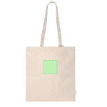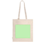 Sac confectionné principalement en coton recyclé de 240 g/m2. Longues poignées de 70cm avec renforcement, finition cousue. Logo en étiquette latérale et résistance jusqu’à 7 kg de poids.